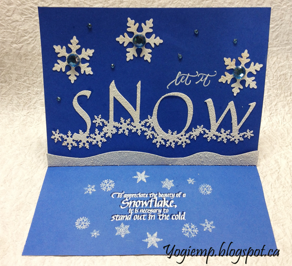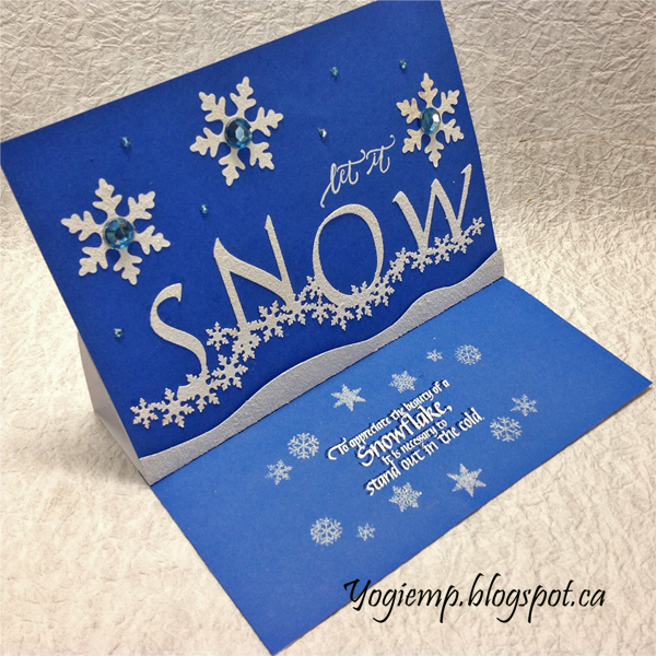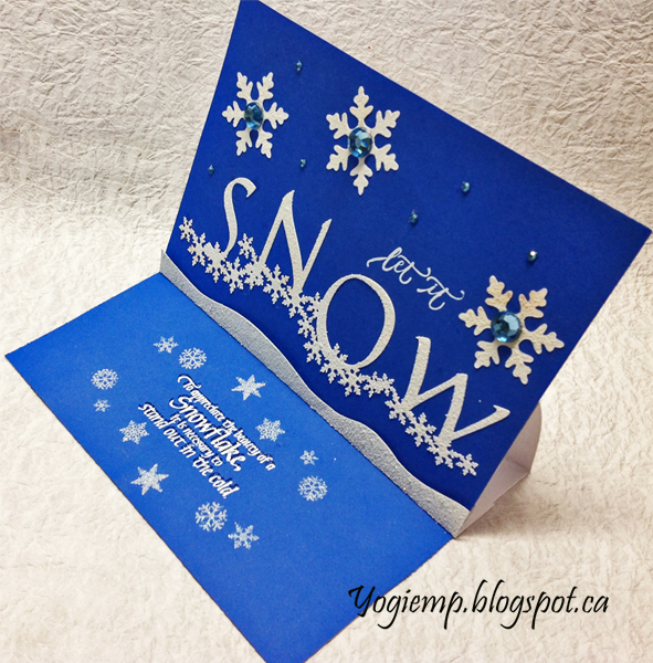 Selected one of the snowflakes from the "Let It Snow Flip card" electronic file and cut from white cardstock 3 times. Inked with the Picket Fence and embossed with the Fallen Snow. Adhered to card front. Added large mid toned blue rhinestones to each center. Also adhered mini of the blue rhinestones adding a dot of Glossy Accents to hold them in place. |