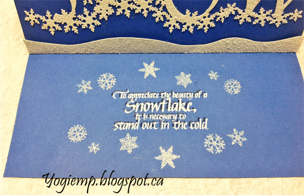 On the floor: On another piece of blue cardstock and using my Tim's Stampin Platform, stamped the quote using Versafine "Blue Lagoon" and clear embossed. Offset my cardstock by about 1mm, both from the bottom edge and the left side edge and re-stamped using the Picket Fence and embossing with the White embossing powder. to the floor. Stamped the snowflake borders with the Picket Fence and embossed with the Fallen Snow. Drew the outline of the Snow word onto white cardstock. Cut with scissors, inked with the Picket Fence - masking off the rest of the cardstock, and embossed with the Fallen Snow. Scored the length, trimmed off the excess cardstock to about 1/2" and adhered to floor to act as my stopper. |