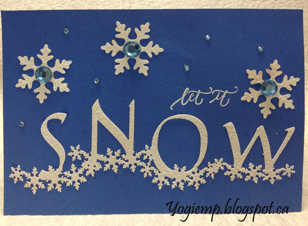 Typed the letters - S N O W, one letter at a time using the "Snowflake Monogram.otf" font from Suzanne. Overlapped the snowflakes to make sure everything was touching something else. Selected everything and increased the size to 6.7" x 2.26". Cut from white cardstock. Inked with Distress Picket Fence and embossed with Emerald Creek "Soft Fallen Snow" - love that texture... Adhered to the blue thin cardstock. Stamped the "let It" using the Picket Fence and embossing with Ranger "White" embossing powder. Adhered the blue cardstock to the white and then onto the card front. |