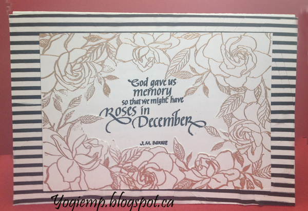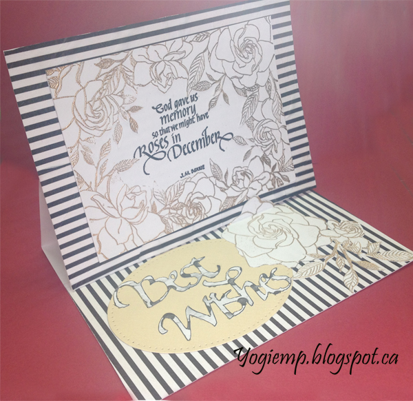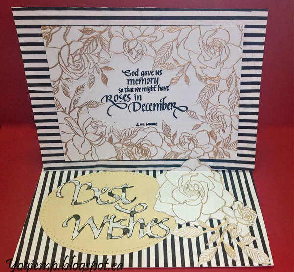 Scored and folded my white cardstock to create the easel structure. The Ton people packaged my stamps in this striped tissue paper... so I adhered it to some white cardstock, cut a piece same size as card and adhered to front. I created a silhouette file of the "Gardenia Border" stamp and cut the interior outline using my Cameo electronic cutter. Stamped using Versafine Toffee and embossed with Queen's Gold embossing powder. Stamped the quote on a separate piece of white cardstock using Versafine Black Onyx and embossed with Midnight Black embossing powder. Adhered to the back of the border cut out and then onto the front of the card. |