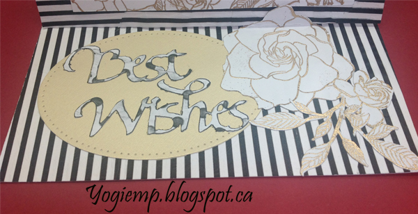 On the floor: Adhered another piece of the tissue paper cardstock to the floor. Die cut the oval Elizabeth Craft Designs "Stitched Ovals" from a gold cardstock (Paper-Garden.ca) and adhered to floor. Die cut the "Best Wishes" from white cardstock, ran through my machine using Crafts Concepts "Dots" embossing folder. Hit the high points with a lack stamp pad and adhered to the gold cardstock oval. Another of the ton stamps I translated to a cut form, stamped with the Toffee and gold embossed. Adhered to floor using part of the flower tip as my stopper. |