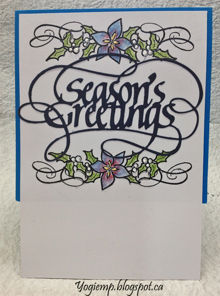 On the inside: Stamped the poinsettia border with the black on white cardstock, clear embossed and painted with watercolors. Added some Liquid Pearls to the flower centers and the berries. Die cut the "Season's Greetings" from a navy cardstock and adhered to inside. Trimmed down the white cardstock and adhered to inside. (Note: my blue cardstock was too short so the white finished of the size...) |