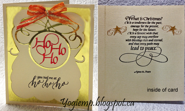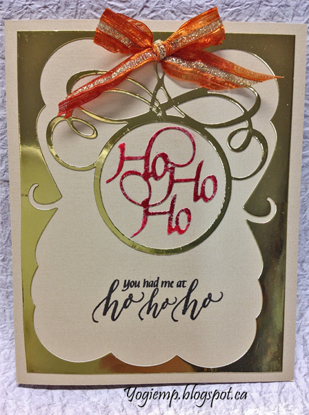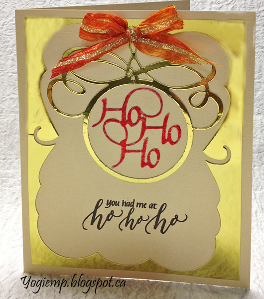 Die cut the large flourished frame from DoCraft gold mirror cardstock and realized the outer contour left behind would make a nice frame as well... so 2 cards from 1 die cut. I adhered it to my card front. Die cut the ornament from the same mirror cardstock ad adhered to front. I had a scrap left over from some heat foil thing I had made and cut my Ho Ho Ho from it. Adhered within ornament. Stamped the Ho Ho Ho quote using Versafine Black Onyx and clear embossed. Tired a red/gold Sari ribbon bow and adhered with hot glue. |