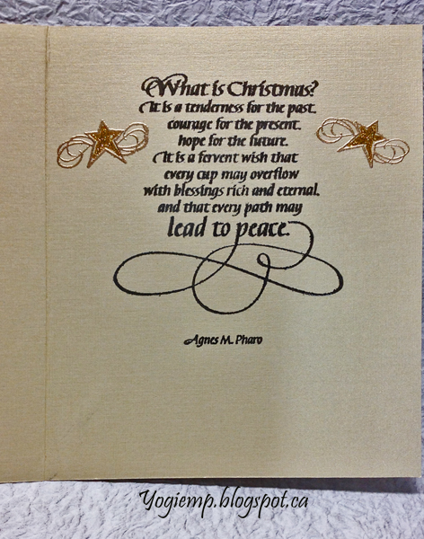 On the inside: stamped the quote using the black and clear embossed. Stamped the star flourishes using Versafine "Toffee" and embossed with Queen's Gold embossing powder. Added some Quickie glue in the star openings and sprinkled with gold micro fine glitter. |