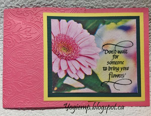 Scored and folded my off set pink toned card. Dry embossed the front using Cuttlebug Anna Griffin ""Pirouette" embossing folder. Adhered the Gerber napkin to a dark green cardstock and then to a bright yellow cardstock. Adhered to front. Stamped the quote using Versafine Black Onyx. |