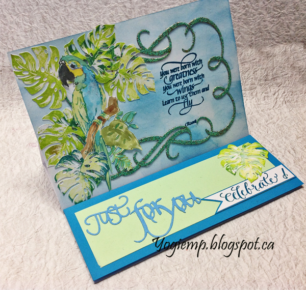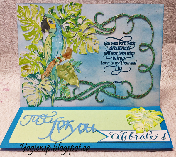 Created: April 4, 2019 I recently got a stamp set that had these lovely philodendron leaves... so had to make a card using them. I'm using a die "Just For You" 2pce set and "Flourished Frame" 2pce set from Elizabeth Craft Designs, also available on Quietfire Design HERE and HERE I'm also using a sentiment stamp from Quietfire Design ("Just For You - Celebrate" 4pce set) And a clear stamp set "Soar Collection" 8pce set from Quietfire Design also available on Elizabeth Craft Designs HERE