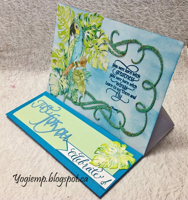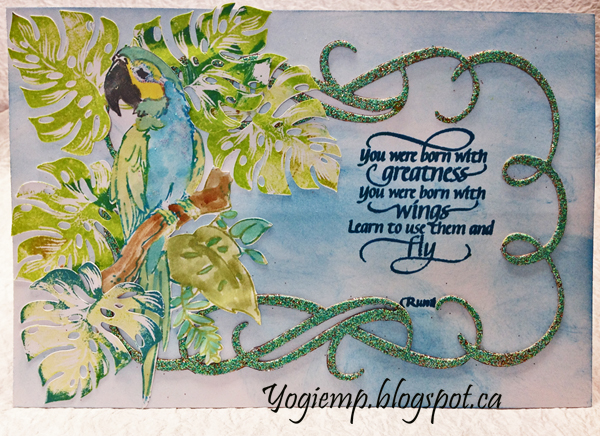 Scored and folded my white cardstock to create my easel structure. Cut a piece of white cardstock same size as card, sponged all over with Distress "Salty Ocean" lightly to create a cloudy sky. Die cut the flourished rectangle frame, inked with a green pad and embossed with Emerald Creek "Verdigris" embossing powder. Positioned it on the cardstock and stamped the quote using Versafine Clair "Warm Breeze" and clear embossed. Adhered to card front. Created a silhouette image of the philodendron leaf and cut with my electronic cutter from white cardstock. Stamped (Kaiser Craft "Paradise Found") using a two tone inking technique. Electronically cut the Macaw, stamped (Starving Artistamps "Macaw 2") using a green and blue Distress pad. Moved color around and added more Distress pad color. Adhered the leaves and bird to card front. |