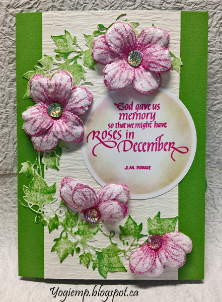 Cut, scored and folded my green cardstock to create the side fold card. Adhered a piece of white Lava heavy textured paper. Stamped, cut, molded and assembled the roses (John Next Door "Christmas Rose"). Applied a layer of clear polish and immediately dipped each petal into Distress Stickles Dry Glitter "Clear Rock Candy" Die cut the ivy corners (John Next Door "Ivy Corner") from white cardstock. Hit direct to paper using Distress "Mowed Lawn" and then a bit of "Forest Moss". Adhered the ivy and flowers in a pleasing manner. Adhered the gems to the flower centers using Gem-Tac adhesive. Stamped the quote using Versafine Clair "Charming Pink" and clear embossed. Die cut with Spellbinder's Circle die set. Sponged around edges with "Picked Raspberry" ad then lightly with "Twisted Citron". Adhered to card. |