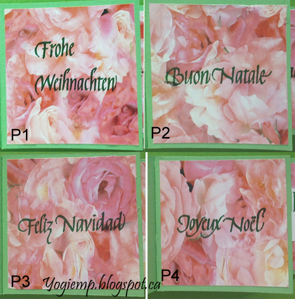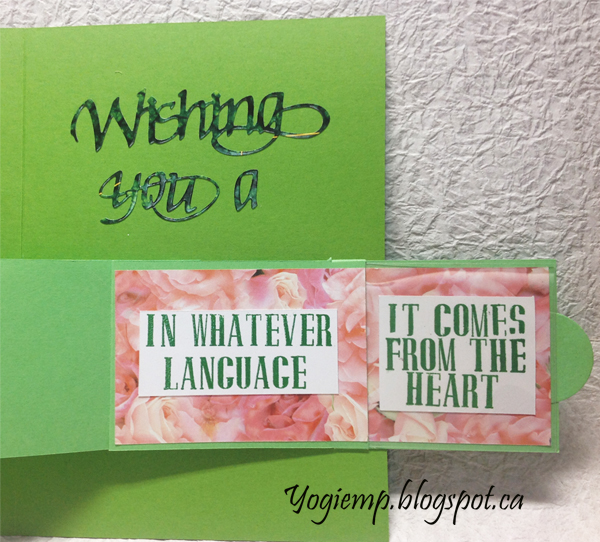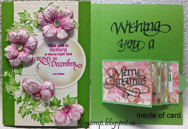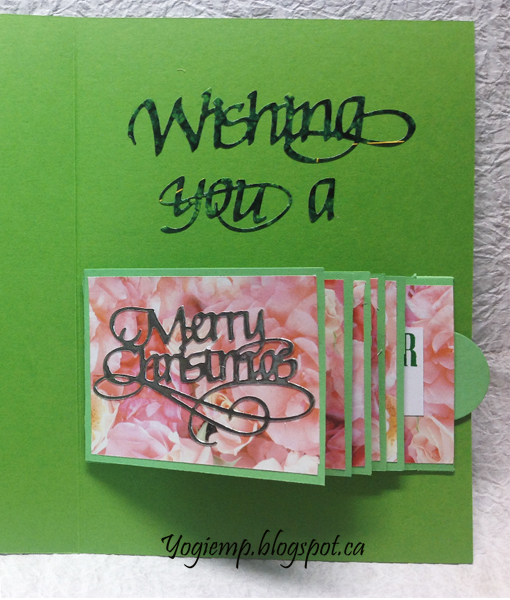 Cut, scored and folded my green cardstock to create the waterfall structure and insert layers. Each waterfall page is 3"w x 2.5"h. Adhered the waterfall structure to the inside of the card. Pulled the tab to make sure it worked BIG GRIN and it did. Cut the rose patterned scrapbook paper (Provo Craft Heather Lancaster "Garden" pad) and adhered to each layer. Stamped and clear embossed each salutation using Versafine Clair "Green Oasis". Die cut the "Wishing You A" from an Oriental Menu mailer. The "Merry Christmas small" in a pale green from Hunkadory "Marvelous Mirror" Pad. The words on the back page stamped using Just Rite "Brayton" alphabet stamps and the green stamp pad, clear embossed on white cardstock. Trimmed down and adhered to pages. I adhered a piece of Graffix plastic to the "It comes..."page so the tab would have no interference in closing.