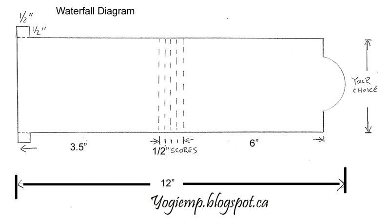The diagram is the basic structure. From a basic 12"w cardstock you can place a 3.5"w image by whatever height you want. This one will hold 4 flaps. Score every 1/2" and fold backwards and front wards to get the cardstock to be supple. Score those little tabs. They are the only thing holding the waterfall onto your card.