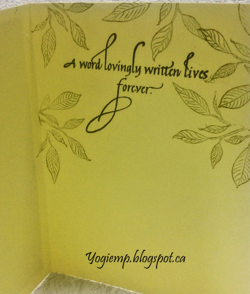 On the inside: stamped the quote with the black and clear embossed. Stamped the leaves (The Ton "Amazing Gardenia") using Distress "Forest Green". |