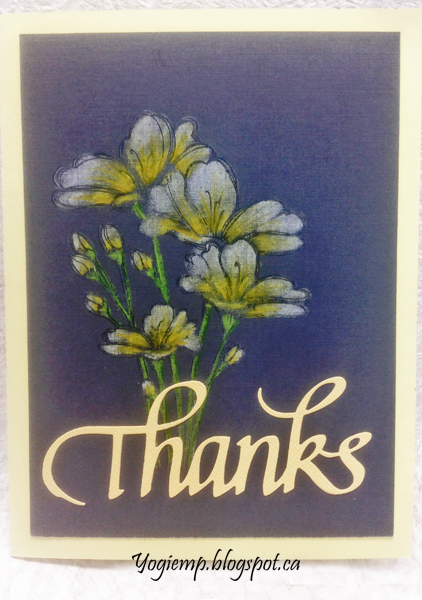 Lovingly Written Side folded my yellow card. Stamped the flowers on a deep gray cardstock using Distress "Mustard Seed". Colored with Prisma colored pencils. Found I didn't have enough definition so over stamped with Versafine Black Onyx. Trimmed down and adhered to card front. Die cut the "Thanks" from a yellow cardstock and adhered to front. |