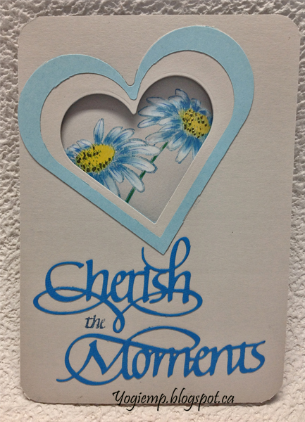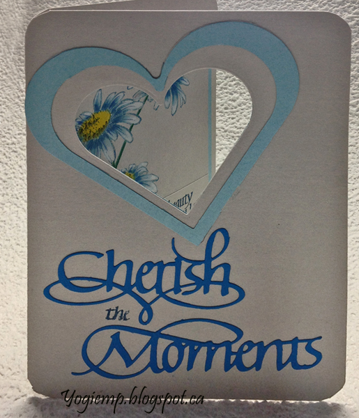 Scored and folded my light gray cardstock. Die cut the aperture with Spellbinder's "Classic Heart" die set. Die cut a larger heart from light blue cardstock and adhered to opening. Die cut the "Cherish", "Moments" from a deep blue textured cardstock and adhered to card front. Stamped the "the" using Versafine "Majestic Blue" and clear embossed.