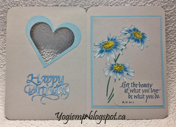 On the inside Left: Stamped the daisies (Stampendous "Daisy Stem Trio") using a matching color on light gray cardstock. Colored with Prisma colored pencils. Added some Liquid Pearls "Avocado" to the flower centers. Trimmed down and adhered to a light blue cardstock. Adhered both to inside, positioning it with the heart opening. Stamped the quote using Versafine "Majestic Blue" and clear embossed. Trimmed down, rounded two edges and adhered to card. |