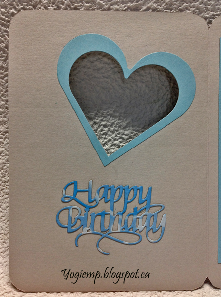 On the inside Right: Cut another heart from the blue cardstock and adhered to opening. Die cut the "Happy Birthday" from a tissue box cardstock. Adhered to inside. |