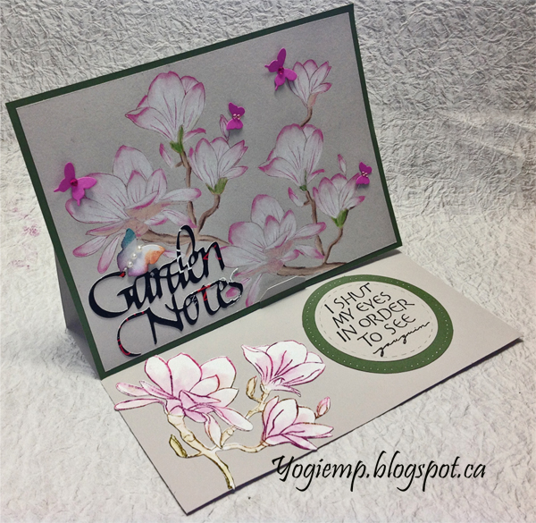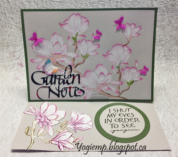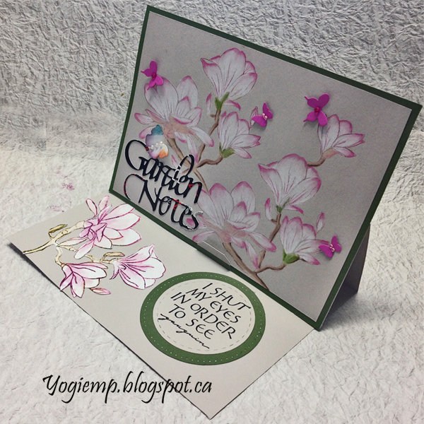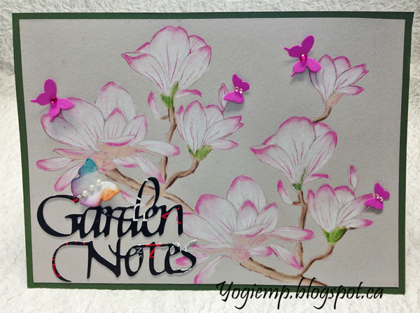 Scored and folded my light gray cardstock to create the easel structure. Cut a piece of olive green cardstock same size as card and adhered to structure. Stamped the Magnolias, masking where needed (The Ton "Magnificent Magnolias") onto a light gray cardstock using similar colors of Distress ink. Colored with Prisma colored pencils. Adhered to card front. Adhered little butterflies - the pink are the drop out pieces from a "Butterfly Spray" die from Quietfire Design. I added light pink and deep pink rhinestones to the bodies. The larger butterfly is an unknown die. Die cut the "Garden Notes" from one of the packaging cardstock in my stash.... Adhered to card front. |
