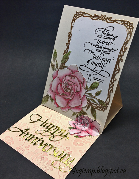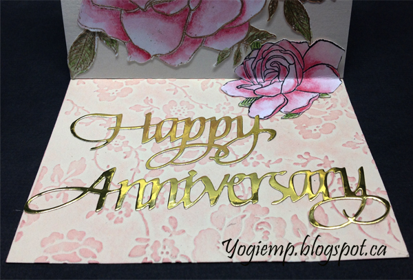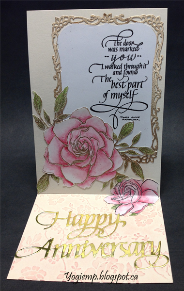 On the floor: Dry embossed the Cuttlebug Anna Griffin "Rosa" on the floor. Hit the high points with Distress "Spun Sugar". Die cut the "Happy Anniversary" from DoCraft gold metallic cardstock. Adhered to floor. Added the smaller rose flower (The Ton "Gardenia Wishes") which I cut away from the larger image. Adhered partially to floor to act as my stopper. |