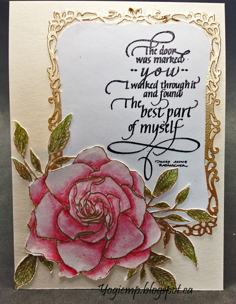 Scored and folded my cream toned cardstock to create the easel structure. Cut a piece same size as card from a white gold pearlescent cardstock (https://www.paper-garden.ca/) and adhered to card front. Die cut the Spellbinder's "Decorative Labels 8" from white cardstock. Created a paper mask of the center area and inked the border with Versafine Toffee, then embossed with Queen's Gold embossing powder. Stamped the quote with Versafine Black Onyx and clear embossed. Adhered to card front off set. Created a silhouette image of the flower (The Ton "Amazing Gardenia") and cut with my electronic cutter from white cardstock. Stamped with the toffee and embossed with the gold. Colored with Derwent watercolor pencils and a water brush. Adhered to card front. |