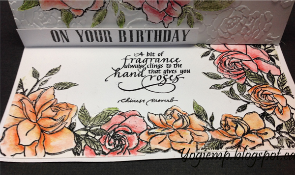 On the floor: Created a silhouette image of the flower frame (The Ton " Gardenia Border") and cut with my electronic cutter from white cardstock. Stamped with the Black and clear embossed. Colored with Derwent watercolor pencils and a water brush and Prisma colored pencils. cut the border apart and reassembled adhering to card front. Stamped the quote with the black and clear embossed. Stamped the "On You Birthday" using Just Rite "Brayton" alphabet set with the black on white cardstock, clear embossed. Trimmed down and adhered to floor to act as my stopper. |