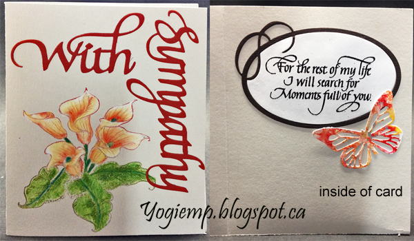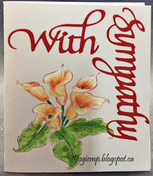 Scored and side folded my gray cardstock. Stamped the Calla Lilies (Flourishes "Calla Lily") on front of card using similar colors of Distress ink. Colored with Prisma colored pencils. Die cut the "Warm Thoughts' from a brownish burgundy cardstock. Adhered to card front. |