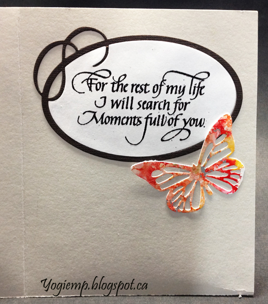 On the inside: Die cut the Flourished Oval from black cardstock and adhered to inside. Stamped the quote using Versafine Black Onyx on a white drop out piece from another die cut, clear embossed and adhered to oval. Die cut the butterfly from an alcohol background I made a while back. Adhered to oval. |
