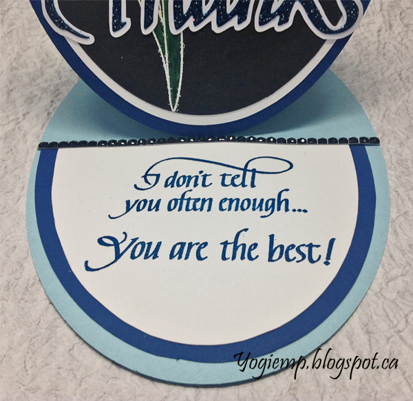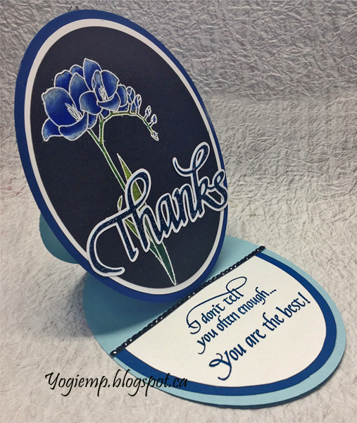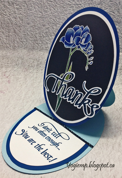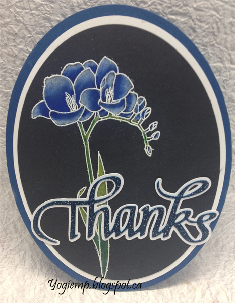 Scored, folded and die cut (Spellbinder's Grand Oval set) my light blue cardstock to create the easel structure. Die cut a dark blue layer same size as card and adhered to card front. Stamped the Freesia (Altenew "Fresh Freesia") on black cardstock using Distress Picket Fence stamp pad and embossing with StampMania "Glacier White" embossing powder. Colored with Prisma colored pencils. Die cut with the Grand Ovals die set. Cut an under layer from a white cardstock. Adhered together then onto card front. Die cut the "Thanks" from a light blue cardstock. inked with Distress "Faded Jeans" and embossed with Emerald Creek Hot Stuff "Midnight Sky" embossing powder. Created and cut an under layer from white cardstock. Adhered both together then adhered to floor
