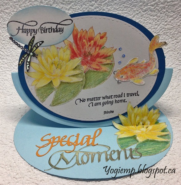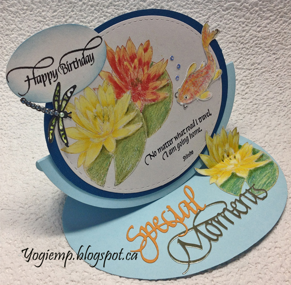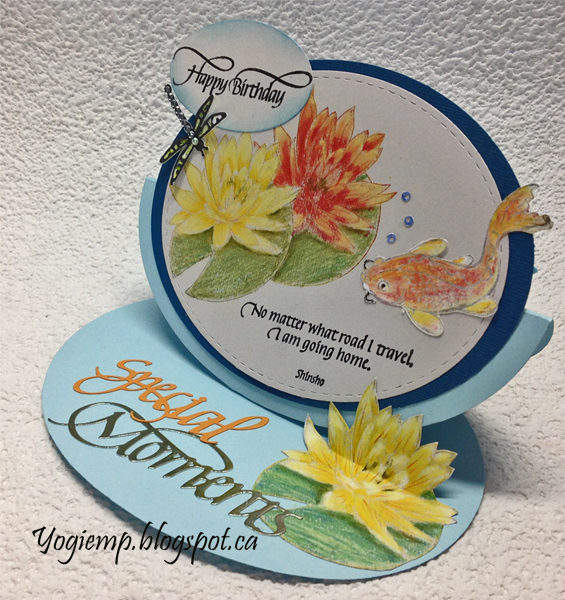 Scored and folded my light blue cardstock to create the easel structure. Die cut with Spellbinder's "Grand Ovals" die set. Stamped the water lilies (My Favorite Things "Flower Set 3") on light gray cardstock using similar colors of Distress pads. Colored with Prisma colored pencils. Die cut with Elizabeth Craft Designs "Stitched Ovals" die set. Cut an under layer from a deep teal textured cardstock using the Spellbinder's die set. Adhered all together then onto card front. Created an electronic file and cut the koi (Designs By Ryn) with my Silhouette Cameo machine from light gray cardstock. Stamped with matching Distress colors and colored with Prisma colored pencils. Adhered to card front. Punched some very small circles with two sizes of punches to create the bubbles. Stamped the sentiment with Versafne Black Onyx and clear embossed. Die cut with Spellbinders oval die set, sponged edges with some "Salty Ocean" and adhered to edge of card.