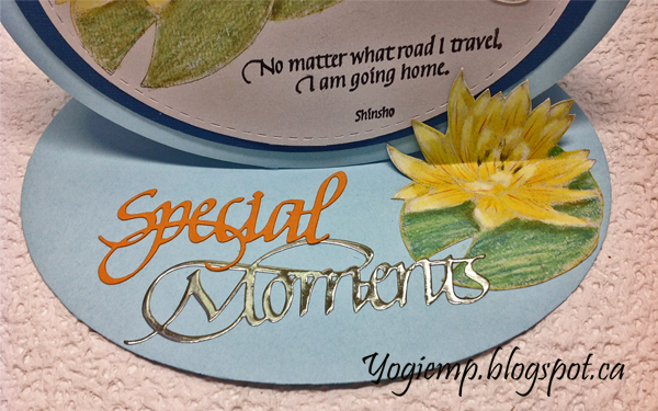 On the floor: Die cut the "Special Moments" from an orange toned cardstock and a metallic grayish cardstock. Adhered both to floor. Adhered the water lily to floor to act as my stopper