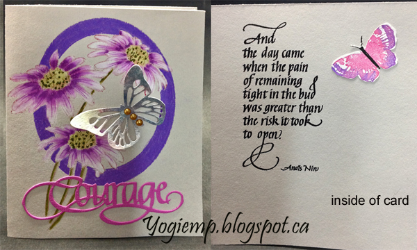 Created: February 18, 2019 I'm continuing with coloring projects on light gray cardstock... Can you believe this is another one layer card... Sheesh what's happening to me! I'm using a die "Courage", and "Butterfly Flourish" 3pce set from Elizabeth Craft Designs, also available on Quietfire Design HERE, and HERE I'm using a rubber stamp quote from Quietfire Design ("And The Day Came"); ("Butterflies Dragonflies" 7pce set)