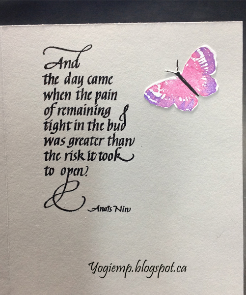 On the inside: Stamped the quote using Versafine Black Onyx and clear embossed. Created a silhouette image of the butterfly and cut with my electronic cutter. Stamped using Distress pads in a pink and blue and misted with water. Colored the body with a black marker. Adhered to inside of card. |
