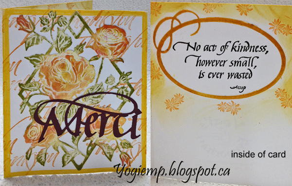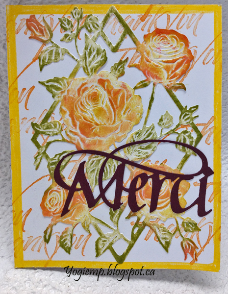 Kindness" Side folded my white card. Used a yellow Prisma colored pencil to create the border. Randomly stamped the "Thank You" using Distress "Dried Marmalade" all over. Die cut the Rose Trellis (Tattered Lace "Cotton Candy") and colored with mini Distress pads. Adhered to card front. Die cut the word "Merci" from a brownish maroon colored cardstock. Adhered to front. |