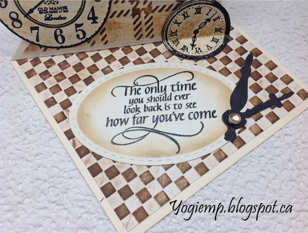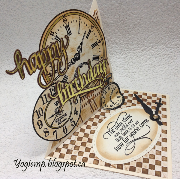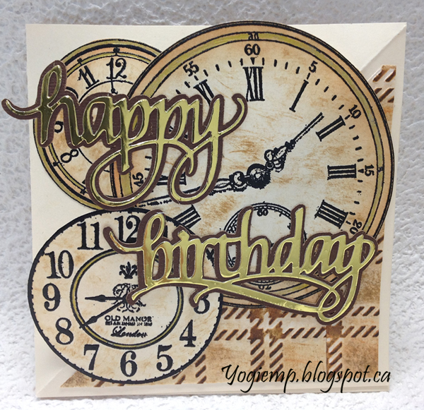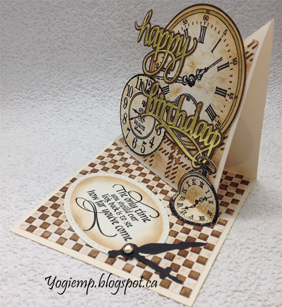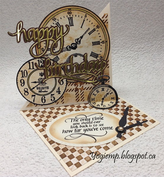 Scored and folded my cream toned cardstock to create the side easel structure. Adhered the dry embossed pieces on the front and floor, splicing together where needed. (Dry embossed the little squares Cuttlebug "Every Day Bundle" and the plaid type design Cuttlebug "Winter Wonderland" set from cream cardstock. Colored with various brown Distress pads. Cut out the frame shapes.) Stamped the clocks (Stamperia "WTKCC21" onto cream toned cardstock using Versafine Black Onyx and clear embossed. Fussy cut around them. Added gold gel pen around the edge. Adhered to front. Die cut the "Happy Birthday" from DoCraft Gold Metallic cardstock. Cut shadow layers from Dark brown textured cardstock (Co-Ordinations). Adhered both together then onto card front. |