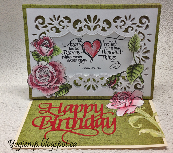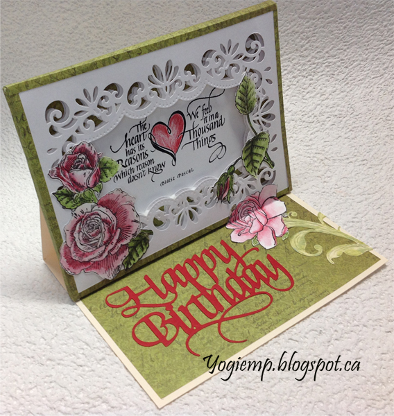 Created: January 22, 2019 OK, I've wanted to make a kind of 3D (depth) easel for a while now, and finally made one. It didn't turn out like I wanted but turned out ok non the less. I used a too large quote and ended up not having any room to add flowers to my under layers. C'est la vie. I'm using a die "Happy Birthday" from Elizabeth Craft Designs, also available on Quietfire Design HERE I'm also using a rubber stamp quote designed by Suzanne Cannon and available on Quietfire Design "The Heart Has Its Reasons..."