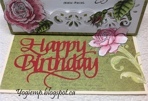 On the floor: Adhered some of the scrapbook paper to the floor. Die cut the "Happy Birthday" from a red cardstock and adhered to floor. Adhered another of the roses (The Ton "Gardenia Border") to act as my stopper. I had some left over flourish (Tattered Lace) from a previous card and adhered to floor. |