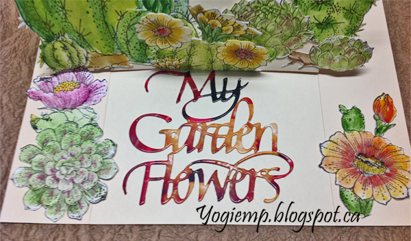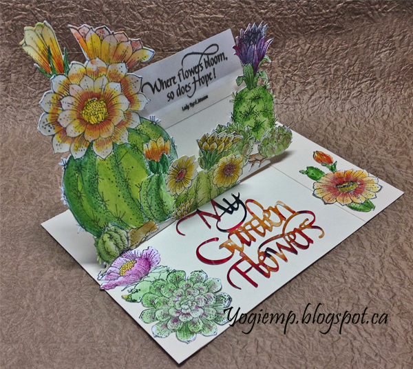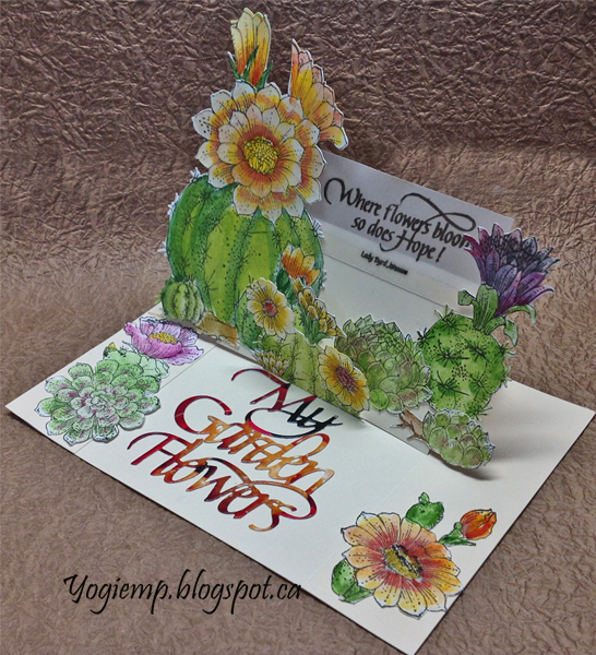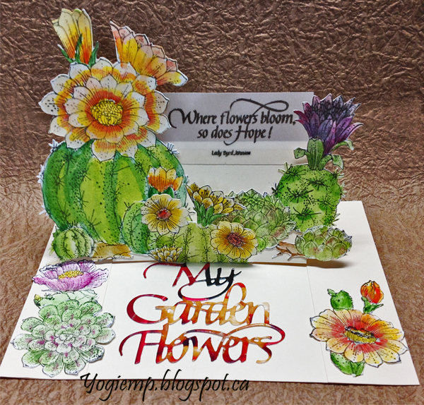 Created: January 25, 2019 I had electronically cut a bunch of Chocolate Baroque cacti images and then stamped and colored them at one of my Wednesday get togethers. They've been languishing in an envelope in one of my "to go to" bins... BIG GRIN. Finally I got to use a bunch of them. I'm using one of the newest die sets "My Garden Flowers" 3pce set from Elizabeth Craft Designs, also available on Quietfire Design HERE And I'm using a clear stamp quote from Quietfire Design ("Where Flowers Bloom" 11pce set), also available on Elizabeth Craft Designs HERE
