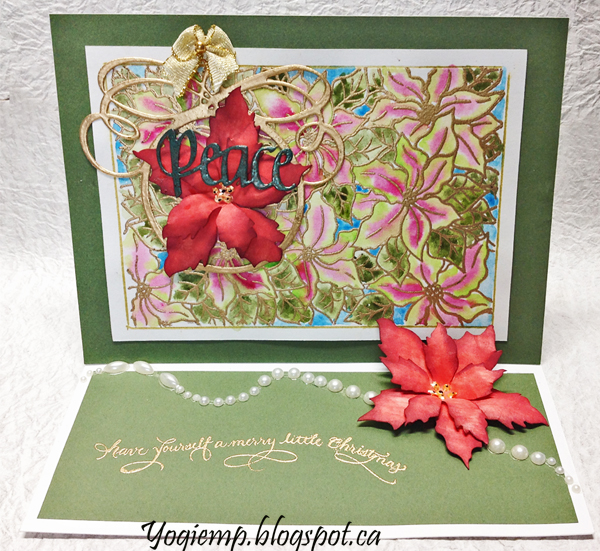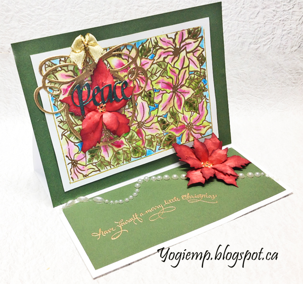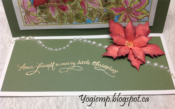 On the floor: Adhered a piece of the green paper. Adhered another of the Poinsettia flowers to act as my stopper. Stamped the quote using the Golden Meadow and embossing with Queen's gold. Adhered the white pearl flourish. |