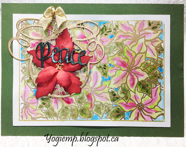 Cut, scored and folded my white cardstock to create the easel structure. Cut another piece of white cardstock and green paper same size as card and adhered both to front. Stamped the Poinsettia background (Woodware) onto white cardstock using Versafine Clair "Golden Meadow" and embossing with Queen's Gold embossing powder. Painted with watercolors. Trimmed down and adhered to card front. Die cut the ornament and "Peace" word from white cardstock. Inked the ornament with the Golden Meadow and embossed with the Queen's Gold, adhered to card front. Inked the "Peace" with a green pad and embossed with Emerald Creek "Patina Oxide" embossing powder. On white cardstock inked with Distress Oxide reds and then the Poinsettia (Sizzix Tim's "Tattered Poinsettia" die) die cut and shaped, adding Liquid Pearls "Butterscotch and when dried adding Sharpie black dots.. Adhered to ornament and then adhered the "Peace". Added the gold mini bow. |