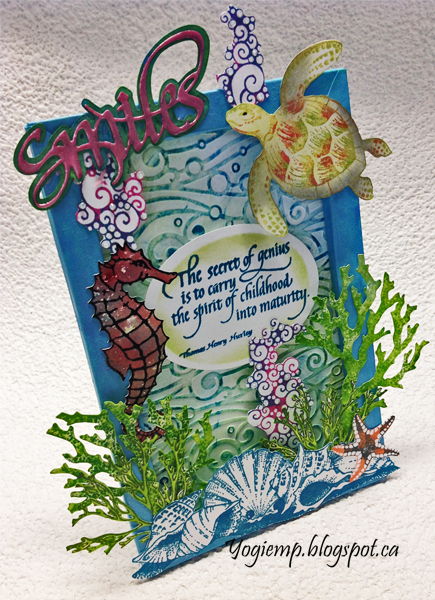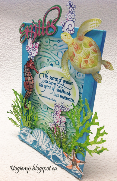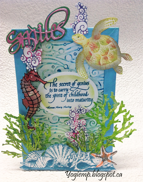 Cut, scored, folded and assembled my white cardstock to create the frame. Painted with Luna Lights light blue mixed with green acrylic paint. Dry embossed the background (Hot Of The Press "Wind and Waves") on white cardstock. Hit the high points with Distress "Salty Ocean" and "Twisted Citron". Trimmed down and adhered to back of frame. Stamped the quote using Versafine Clair "Warm Breeze" and clear embossed. Die cut with Spellbinder's oval die set and edges sponged with the Citron. Adhered to inside with 3D foam tape. Die cut the "Smiles" from a white cardstock inked with Versafine Clair "Charming Pink" and embossed with Pearlescent embossing powder. Then cut a shadow layer and inked with green. Adhered both together. The shell border at the bottom (Chocolate Baroque "Seaside Dreams") was electronically cut and then stamped with Versafine Clair "Warm Breeze" and clear embossed. All the other stamped elements were stamps by Design By Ryn "Sea Creatures 1 & 2" sets. All electronically cut and then stamped and colored. Adhered all the various elements. Final touch added some nail art rhinestones to the bubbles. |