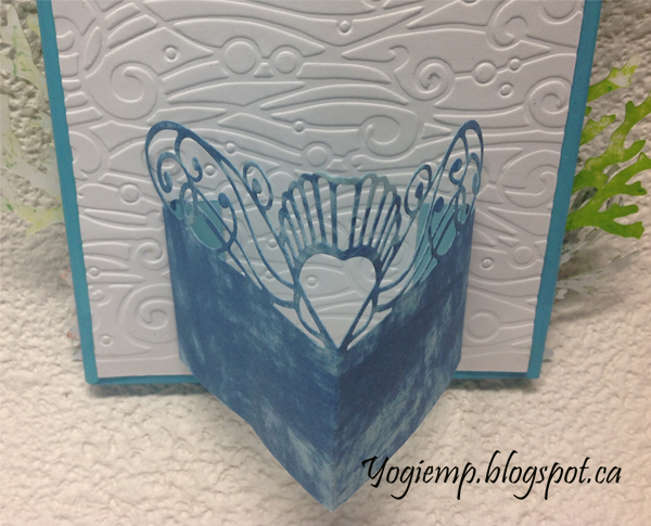 On the back: Die cut the Frantic Stamper "Shell Scroll edger" from light blue cardstock, trimmed down as needed, scored and adhered to frame back. |