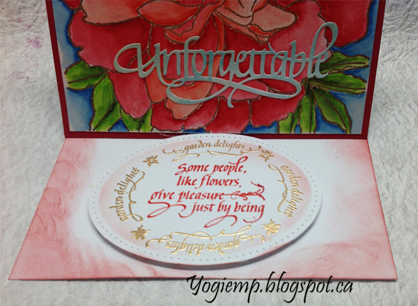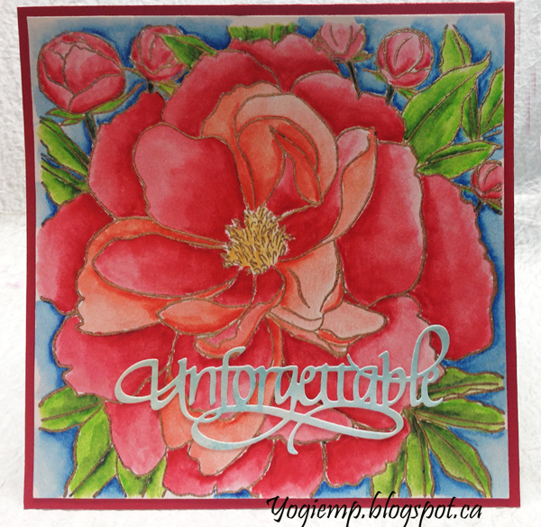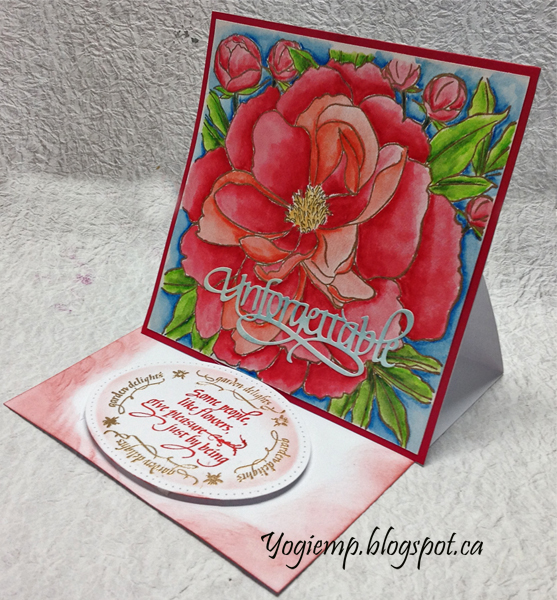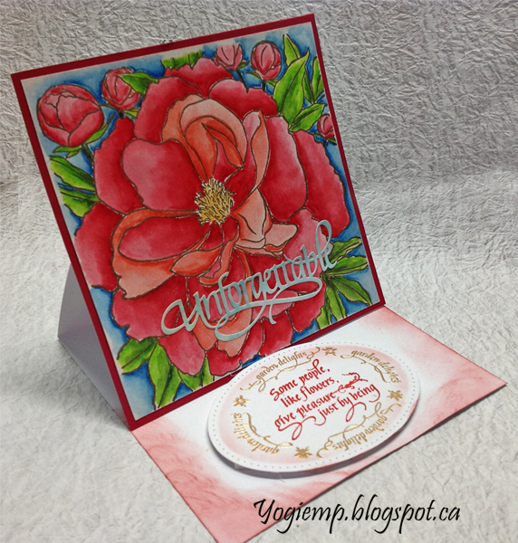 Cut, scored and folded my white cardstock to create the easel structure. Cut another piece of white cardstock and of red paper same size as card and adhered both to front. Stamped the peony onto HP watercolor paper using Versafine Toffee and embossing with Queen's Gold embossing powder. Painted with Winsor and Newton watercolors. Trimmed down and adhered to card front. Die cut the word from a very pale blue cardstock and adhered to front. |