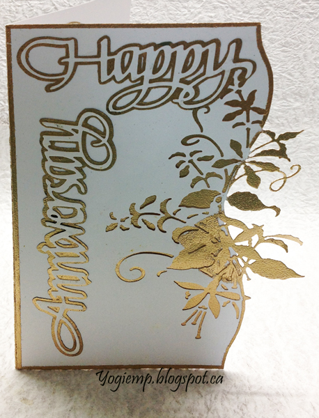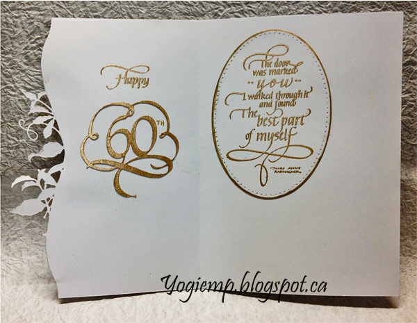 On the inside: Stamped the quote on white cardstock. Die cut with Elizabeth Craft Designs "Stitched Ovals" die set. Edged the oval with a Krylon gold leafing pen. Adhered to inside of card. Stamped the "Happy" with the Versamark and embossed with the gold. Electronically cut the "60" from white cardstock, inked with Versafine Clair "Golden Meadow" and embossed with the Queen's Gold. Added the "th" with a gold gel pen. |