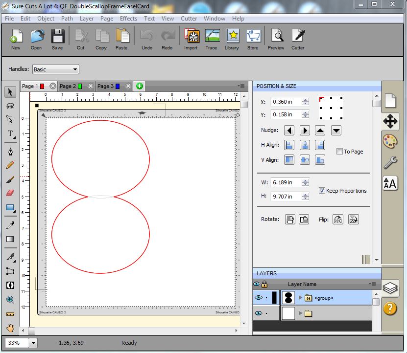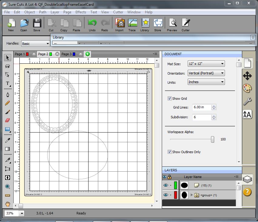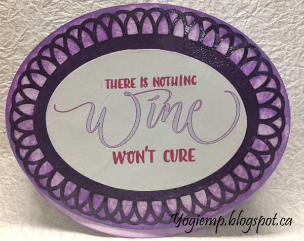 Opened SCAL (Sure Cuts A Lot software) and the - Scalloped Frame. Ungrouped and broke apart to remove the 2 inner ovals, then regrouped the scalloped oval. Cut and pasted the scalloped frame and small oval to page 2 (see pic below). Used the large of the ovals and resized it to the outside dimensions of the scalloped oval. Created a shadow layer or Increased the size by 0.050 Copy this oval and paste it onto page 1 and 2. On page 1, flip the 2nd oval and merge it slightly with the first then weld the 2 ovals. This is the basic structure for the easel. When cut, score down the center of the top oval. Hit the card base direct to paper with Distress Oxide "Wilted Violet". Inked the scalloped frame with Versafine Clair "Monarch" and clear embossed twice. Adhered to card front. Changed the color for the word "wine" and print and cut the oval shape. Adhered to card front. |