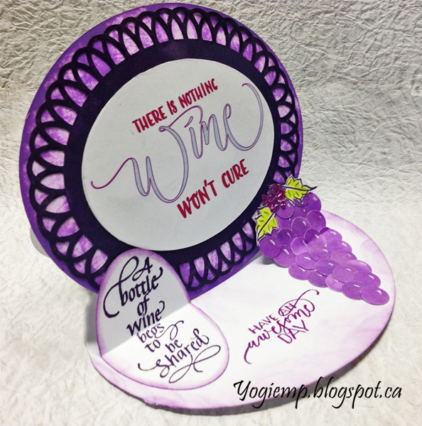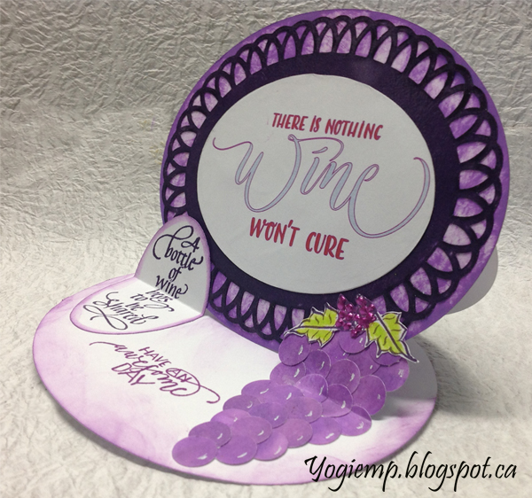 On the floor: colored a piece of white cardstock using the oxide violet pad and clear embossed twice. Punched a bunch of circles using a 1/2" circle punch. adhered to a piece of scrap paper to hold the circles in place. Used a white gel pen to add a highlight to each circle. Stamped the leafy bit (lower portion of the "Wine is Sunlight..." quote) using Versafine Clair "Twilight" and fussy cut around the leaves and grapes. Colored with a Tombow marker and adhered to grape cluster. Folded it about a 1/3 down and adhered to floor to act as my 1st stopper. Cut a small oval, stamped the quote with the Twilight and clear embossed. Folded it between the words and adhered to floor to act as my 2nd stopper. Stamped the sentiment onto the floor using Versafine Clair "Purple Delight" and clear embossed. Sponged some oxide around the edges. Final touch added some Liquid Pearls "Orchid" dots in the leafy grape cluster. |