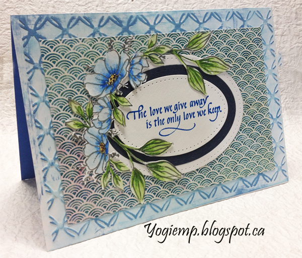 Scored and folded my white cardstock to create my top fold structure. Another embossed folder from my stash... Crafts Too "Lattice". Sponged all over with "Tumbled Glass" and hit the high points with "Faded Jeans". Trimmed down and adhered to card front. Cut a piece of the STAMPtember cardstock and adhered to card front. Raided my stash again for these Stitched Ovals from Elizabeth Craft Designs. Adhered them together and stamped the quote using Versafine Clair "Paradise" and clear embossed. adhered to card front. Electronically cut the flower corner and leaves and colored with Derwent watercolor pencils. Adhered to oval circles. |