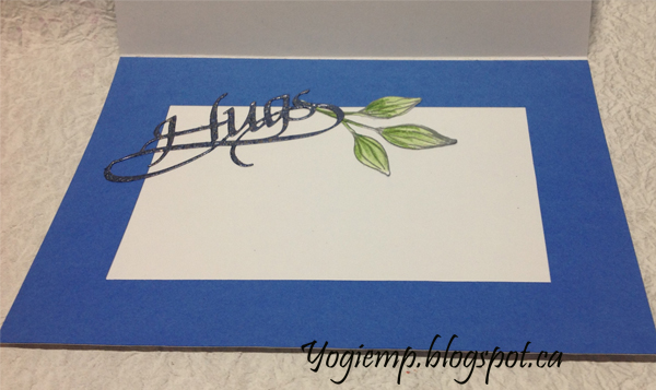 On the inside: Cut a piece of scrap blue cardstock from my stash to create the frame. Die cut the word from blue cardstock inked with Versamark and embossed with Emerald Creek Boho Blends "Lapis Lazuli" embossing powder. Adhered to inside. Adhered one of the leftover leaves. |