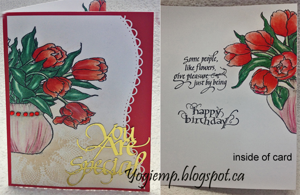Scored and folded my white cardstock to create the side fold card. Adhered a piece of red paper to card front. Opened the digi image (Power Poppy "Tulips in Hobnail Pitcher"), enlarged it and printed out on white cardstock. Colored with Prisma colored pencils. Cut the design basically in half using one side on the front. Used Spellbinder's "A2 Curved Borders" die set for the edge. Created a mask for the bottom section of the vase and stamped with Stampin Up "Hello Doily" using Distress "Picket Fence" and embossing with StampMania "Glacier White" embossing powder. Sponged a touch of Distress brown lightly Die cut the "You Are Special" from DoCraft gold Mirror cardstock. Adhered to card front. As a final touch added red rhinestones to the vase collar. |