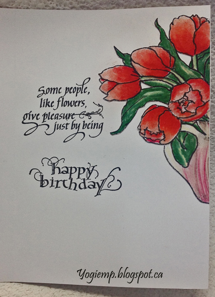 On the inside: Fussy cut the other half of the tulip image and adhered to inside of card. Stamped the quote and sentiment using the Versafine Black Onyx and clear embossed. |