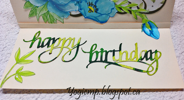 On the floor: Die cut the "Happy Birthday" from another tissue box cardstock and adhered to floor. Adhered a strip of the cream cardstock to the floor to act as my stopper. Adhered one of the buds. And a leaf sprig. |