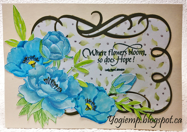 Scored and folded my cream toned cardstock to create the easel structure. Adhered another piece same size as card to front. Created silhouette images of all the flowers and leaves and cut with my electronic cutter from white cardstock. Colored with Tombow markers (boy it's been a while I haven't used those...). Added some Liquid Pearls "Avocado" to the tips of the stamen. Ser aside to dry. Die cut the flourished frame from both the Moda Scrap pad "Let Your Soul Bloom" and a deep greenish brown Co'ordinations pack. Adhered the positive and negative pieces to card front. Stamped the quote using Versafine Clair "Rain Forest". Assembled and adhered all my floral elements. |