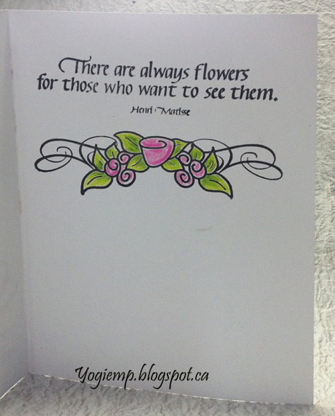 On the inside: Stamped the quote nd border using Versafine Clair - "Morning Mist" and clear embossed. Colored with the Prisma colored pencils. |
